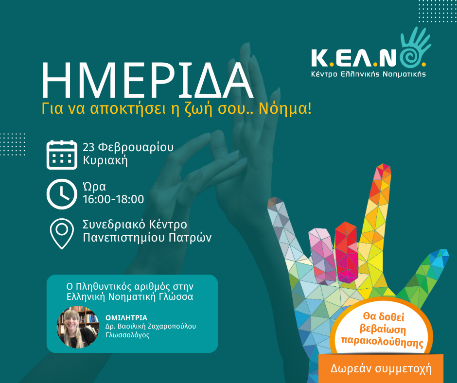 Το Κέντρο Ελληνικής Νοηματικής – Κ.ΕΛ.ΝΟ. σας προσκαλεί σε μια μοναδική ημερίδα, αυτήν την Κυριακή 23 Φεβρουαρίου, 16:00-18:00, στο Συνεδριακό Κέντρο του Πανεπιστημίου Πατρών.
